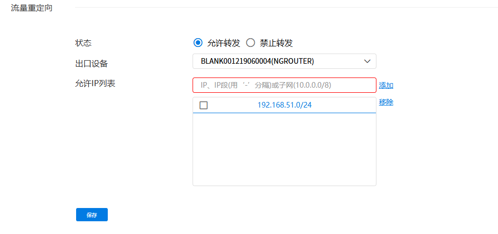 其次,在完成组网之后,进入到流量重定向页面中,配置允许转发,选择出口设备,这些设备是该组中其他设备,不是本机设备